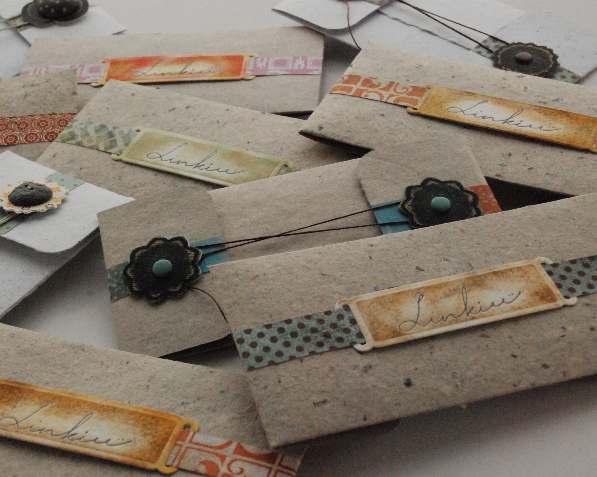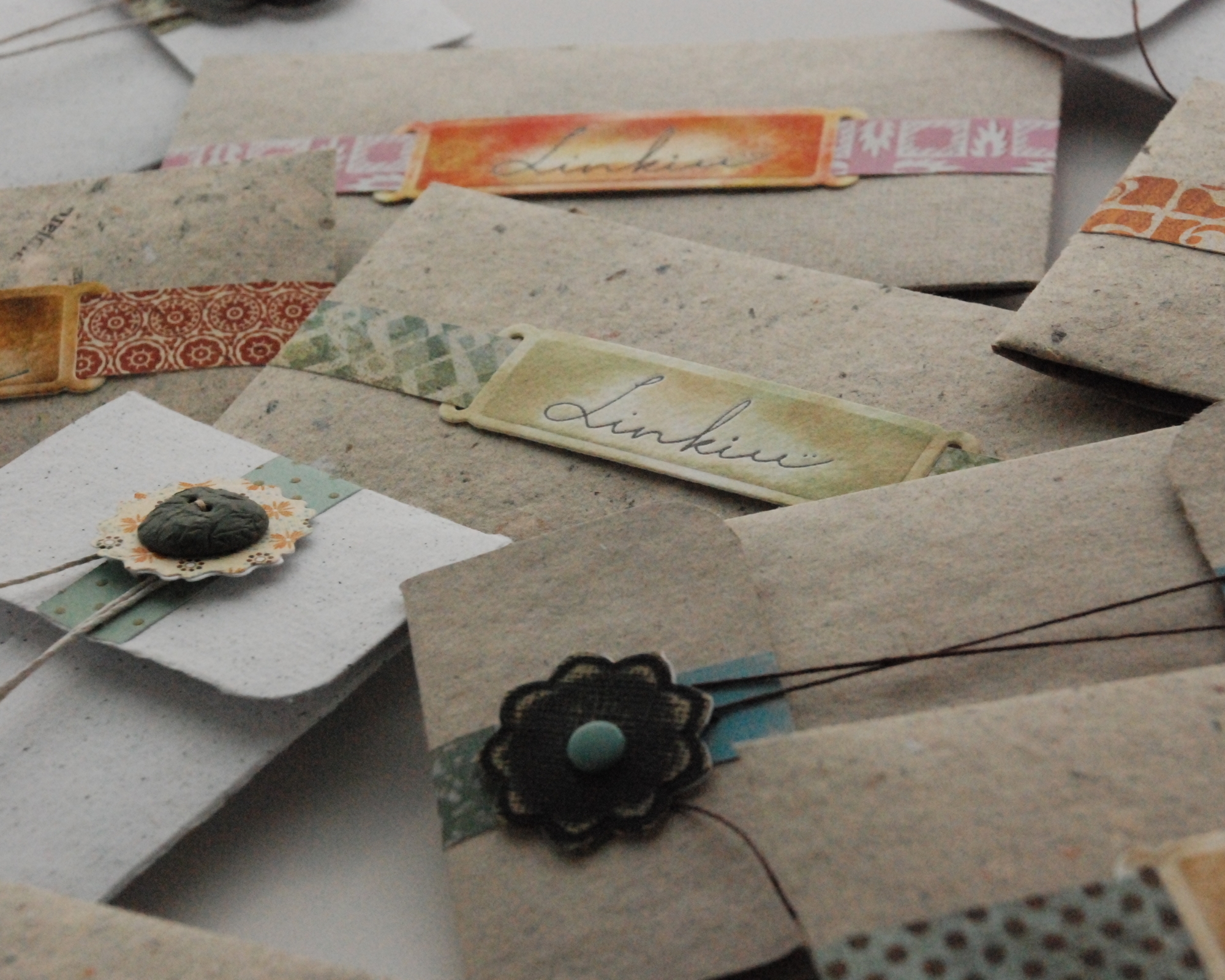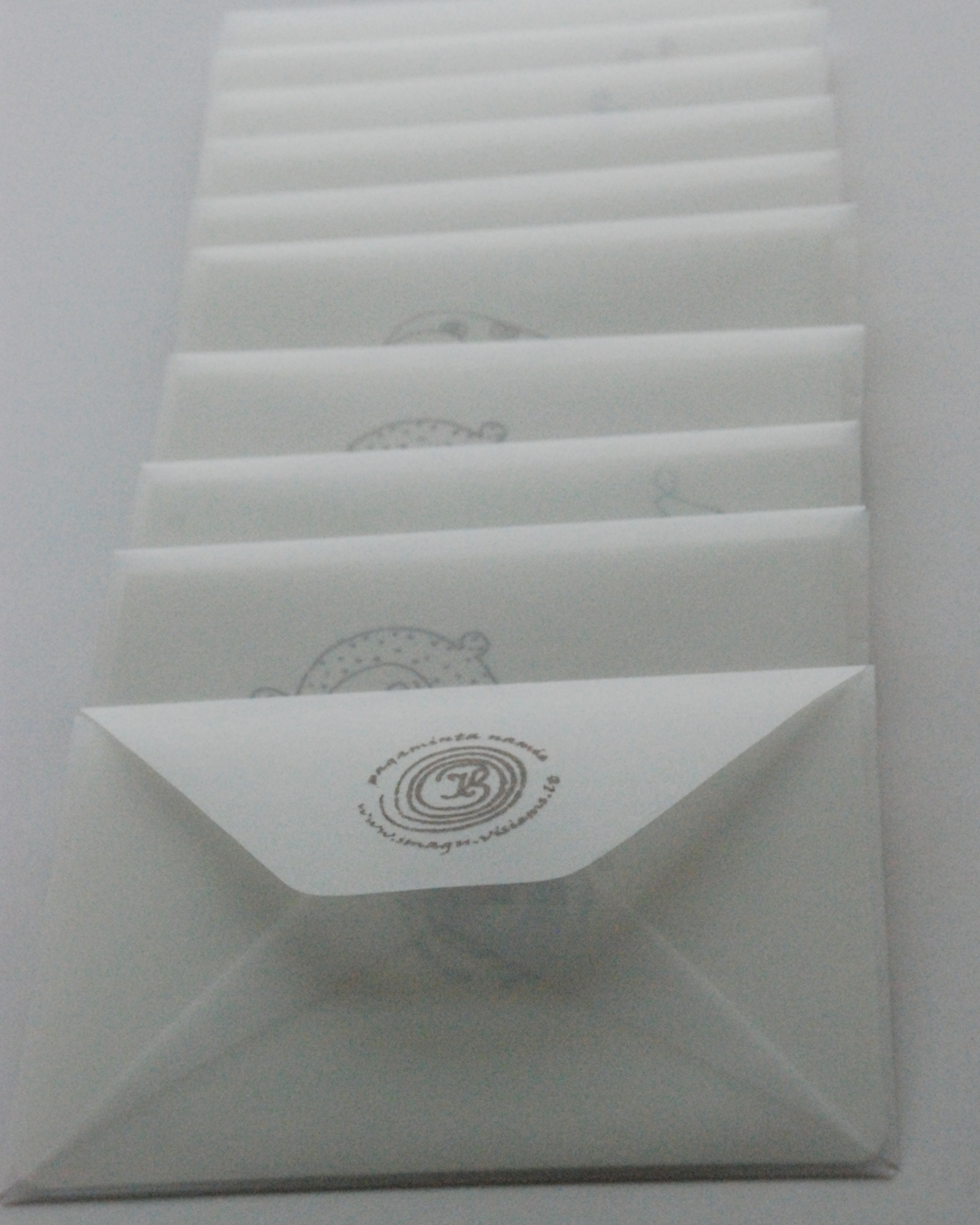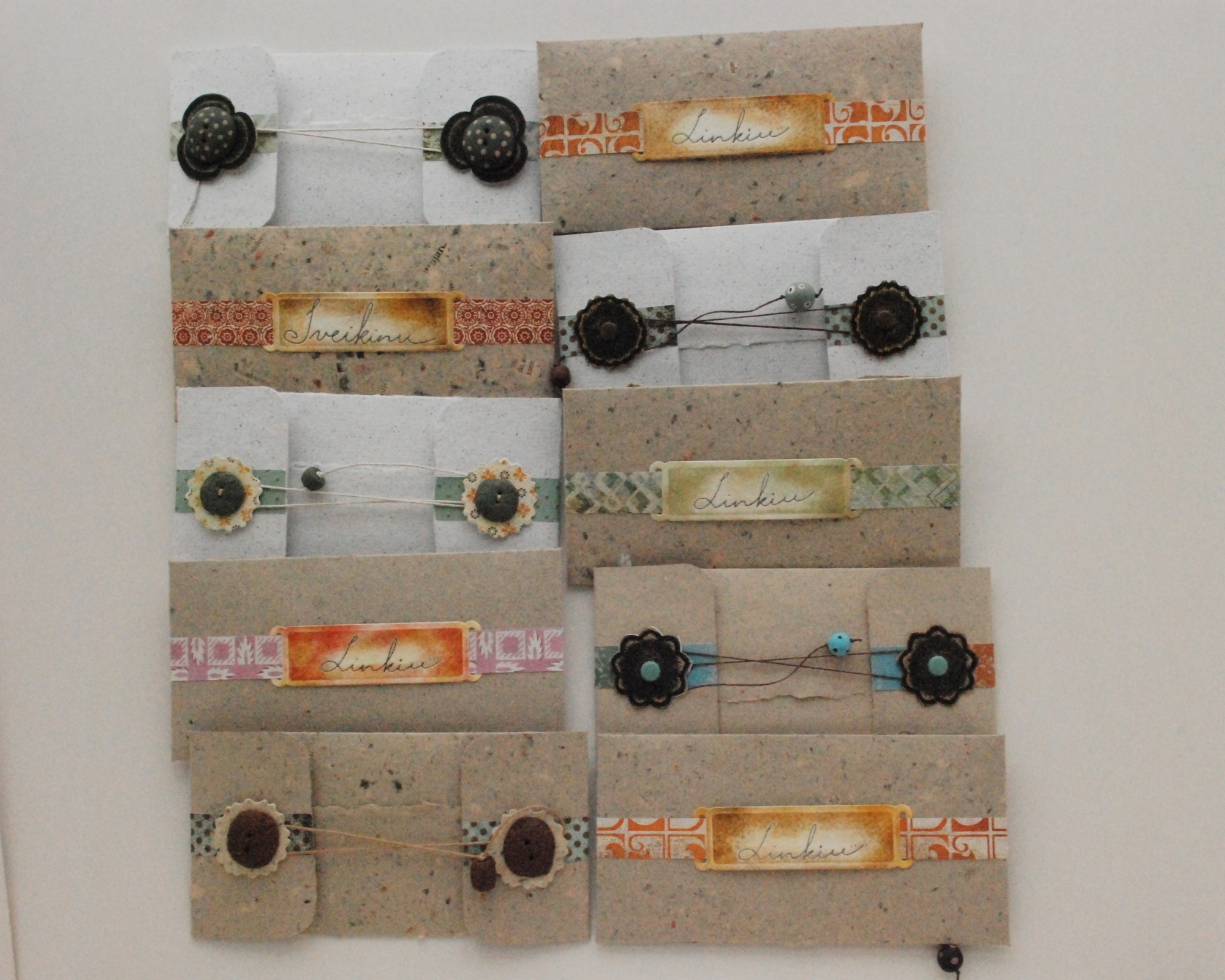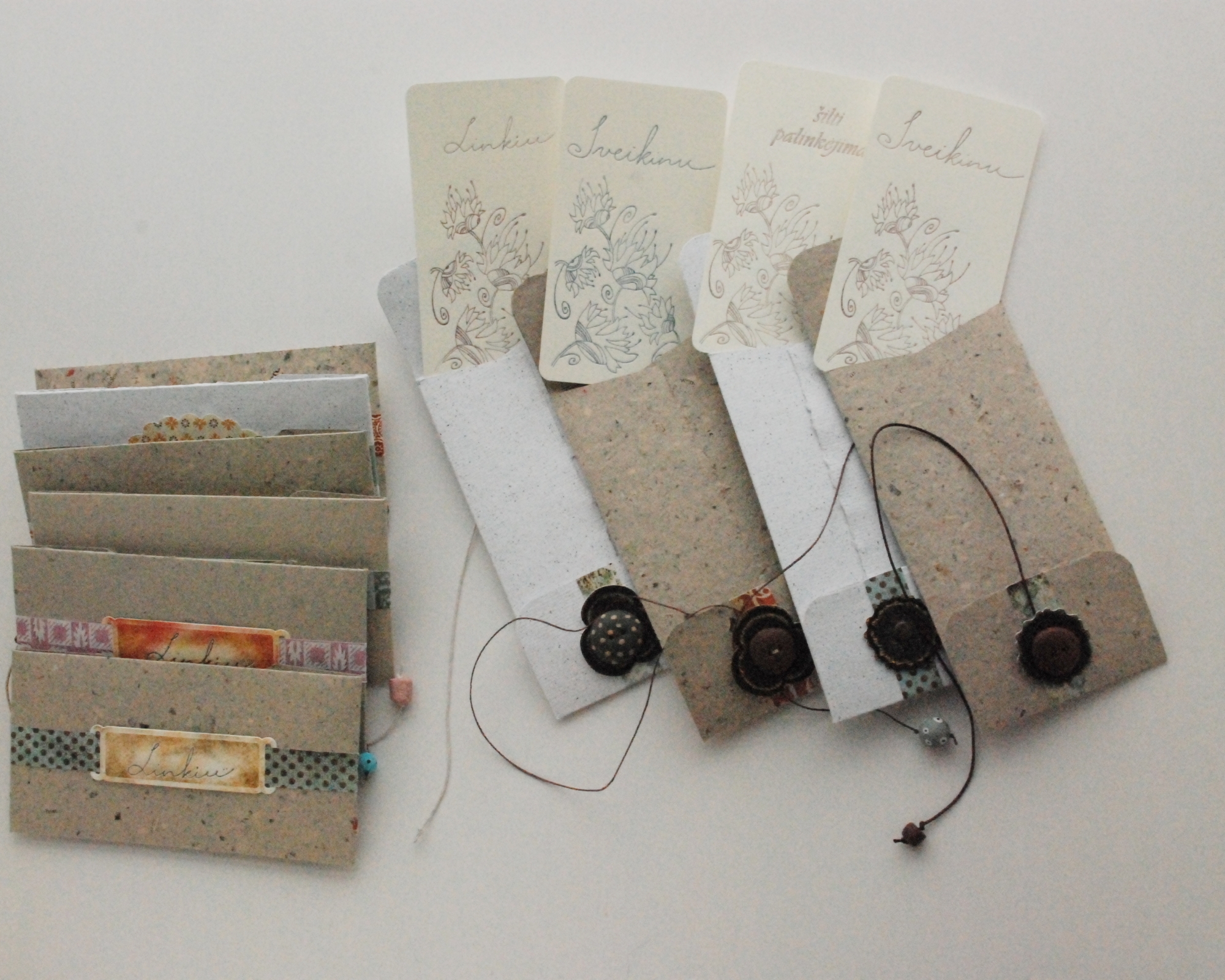 Pailgi vokai buvo pagaminti specialiai dovanojamiems banknotams pakuoti. Vokeliams panaudojau savos gamybos perdirbtą popierių (šiek tiek popieriaus gamybos proceso nuotraukų galite rasti šiame albume Flickr). Spaudus atvirukuose ir vokuose panaudotiems antspaudams ir įspaudams pasigaminau taip pat pati iš fotopolimerų. Vokuose taip pat panaudojau savos gamybos sagutes ir karoliukus. Tokie vat smarkiai rankų darbo popieriniai dalykai gavosi :)